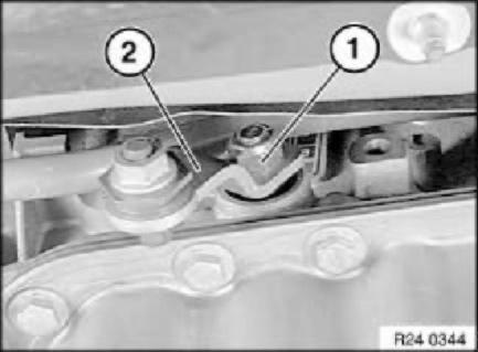 Unfasten nut (1) and pull shift lever (2) off manual shift valve shaft.