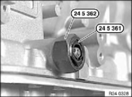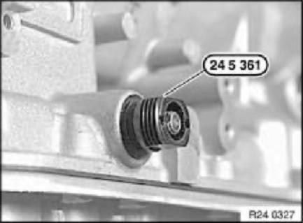 Screw special tool 24 5 362 onto 24 5 361 and tighten to pull radial sealing ring out of transmission housing.