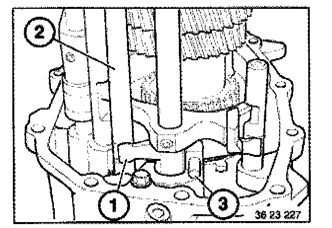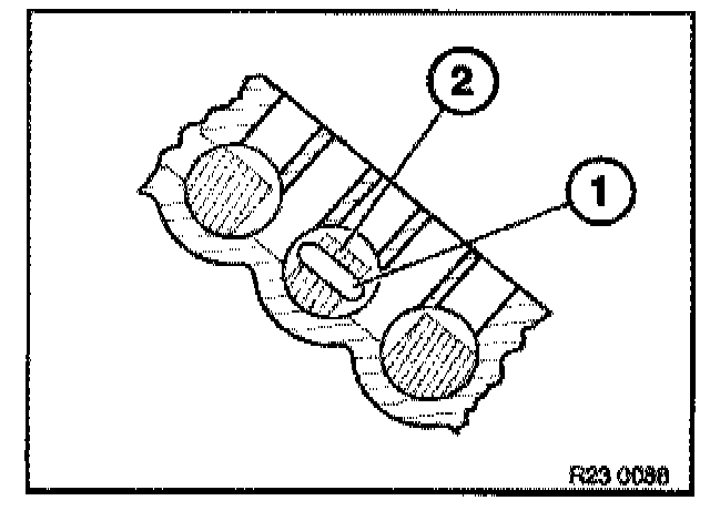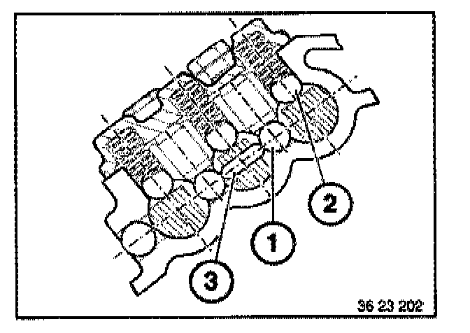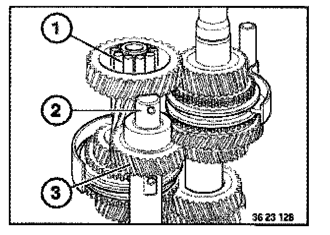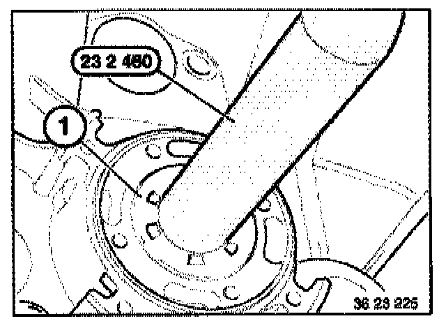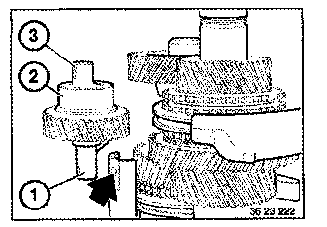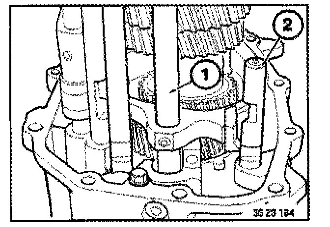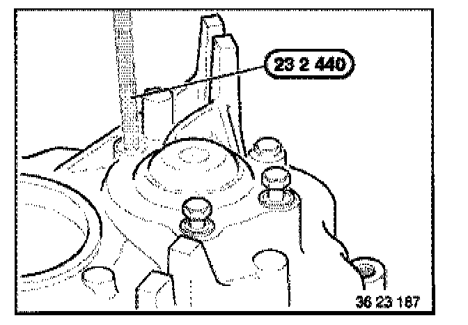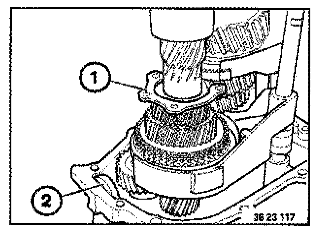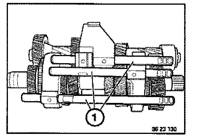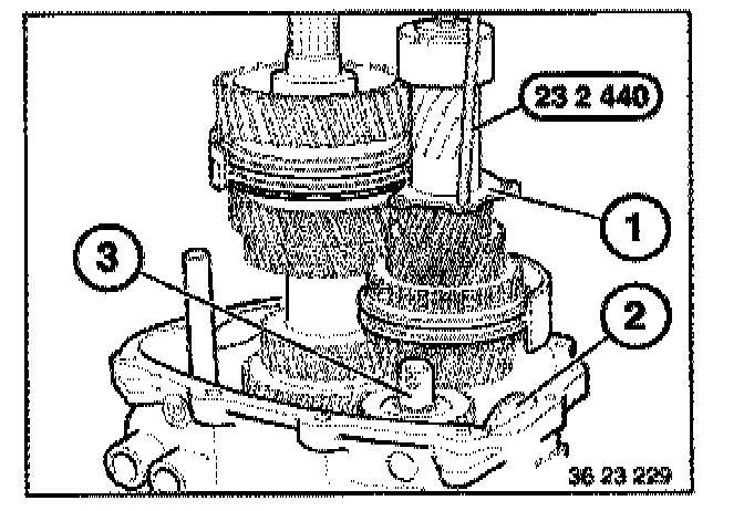 Place retaining plate (1) with flat side uppermost on 2nd gear on countershaft. Screw special tool 23 2 440 into the retaining plate (1)