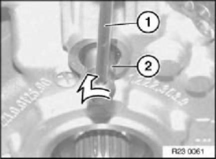 Coat the radial seal sealing lip with ATF-oil. Push radial seal (1) over special tool 23 2 460 up to case.