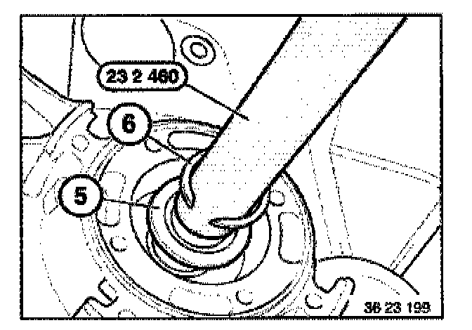 Caution: To avoid damaging input shaft, special tool 23 2 460 must be inserted on the input shaft while installing the circlip (6).