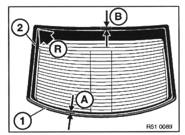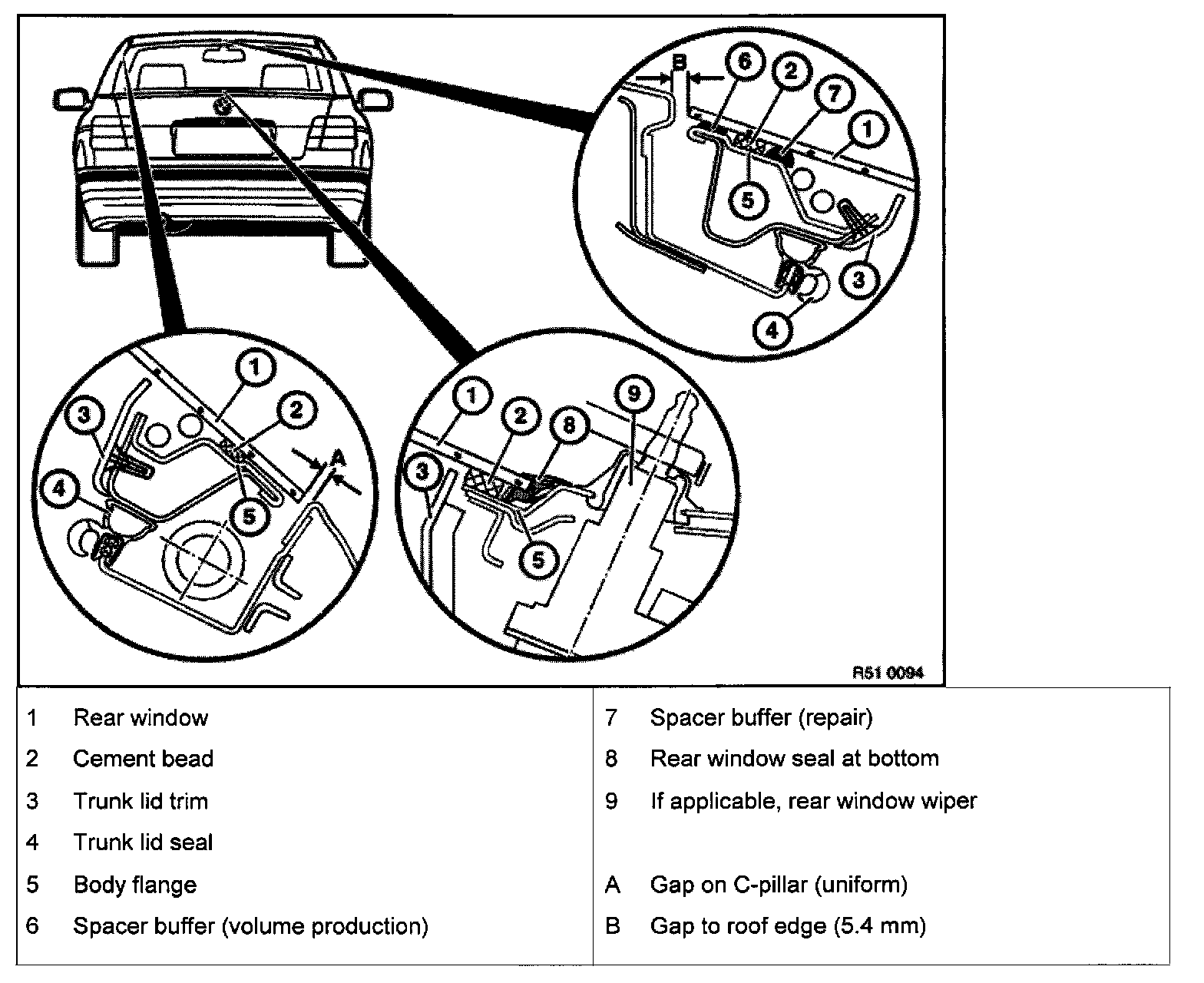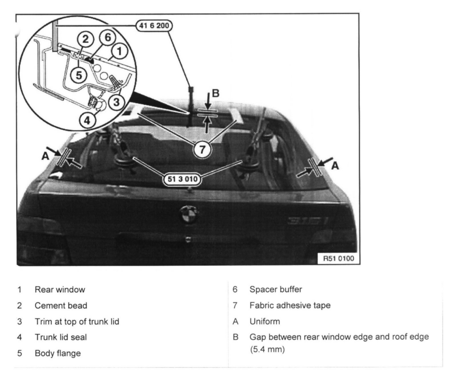 Treat rear window and body around cemented area with BMW-approved materials (repair kit, Sourcing Reference: BMW Parts Service),