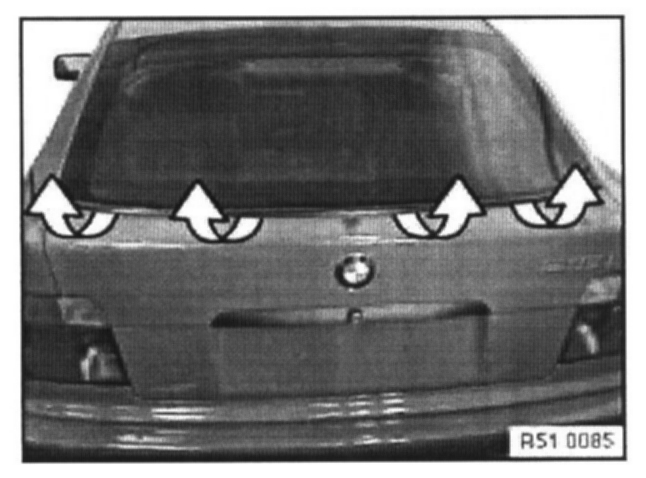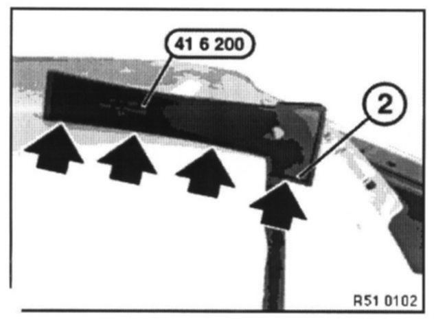 Fit special tool 41 6 200 (left and right over the hinge) with the short leg (1) facing the rear window.