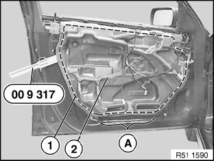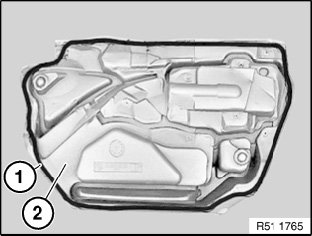 Using special tool 00 9 317, lever out sealing bead (1) of sound insulation (2) completely or if necessary partially.