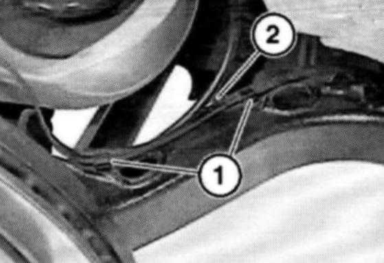 Open cable fasteners (1). Pull cable (2) out of fasteners on rear swinging fork.