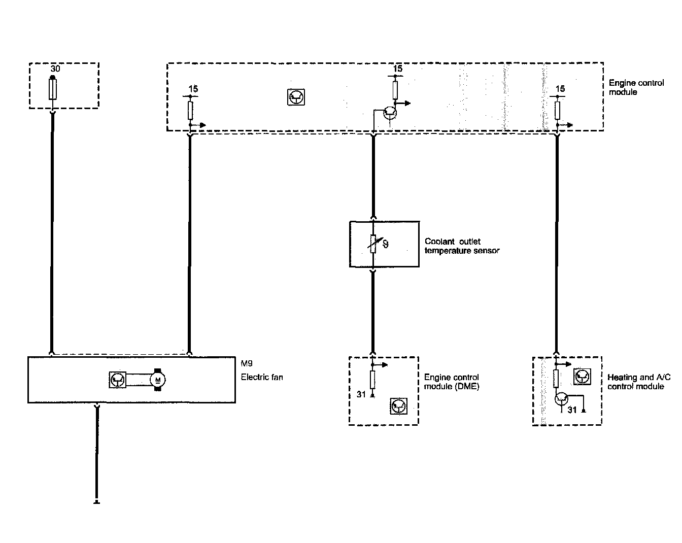 The auxiliary fan request comes from the IHKA control module via the K-Bus. The fan speed request is based on the refrigerant pressure sensor input to the IHKA. Additional factors monitored by the ECM that influence fan operation are: