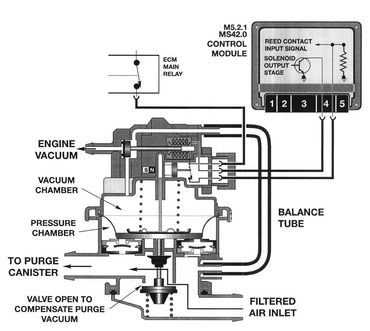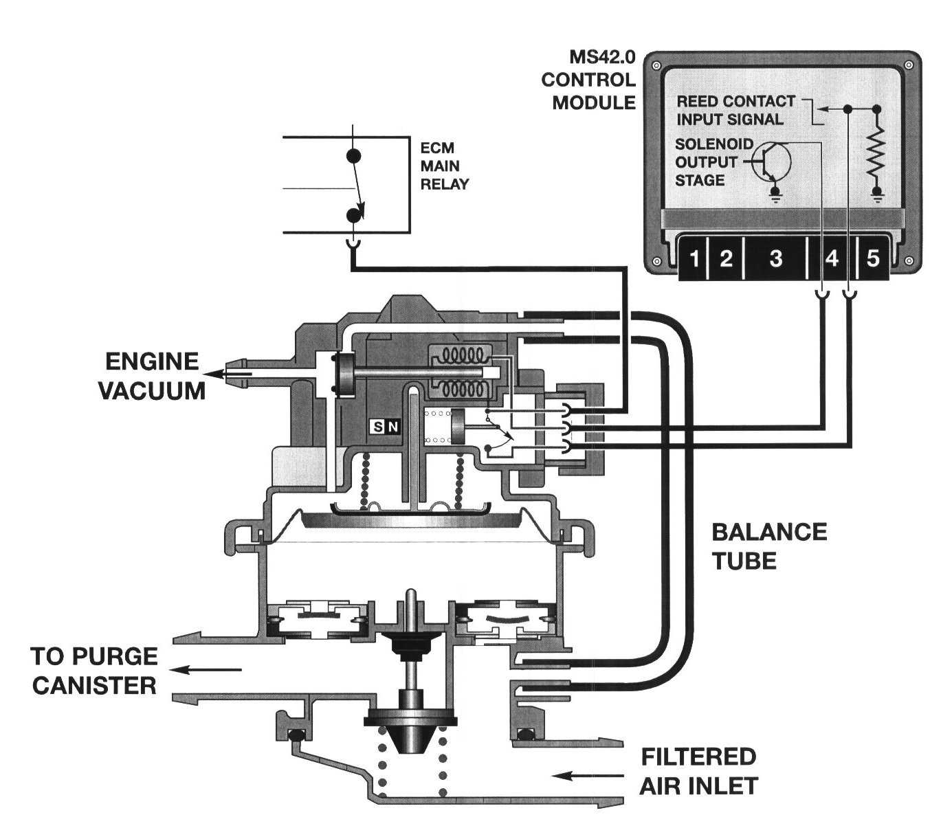 - The solenoid is then de-energized, spring pressure closes the vacuum port blocking the engine vacuum and simultaneously opens the vent port to the balance tube which releases the captive vacuum in the upper chamber.