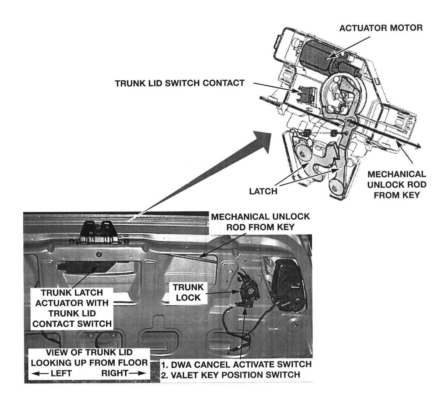 - DWA Cancel Switch: When the trunk is opened with the key, this switch provides a ground signal to the GM preventing the DWA from activating if armed.