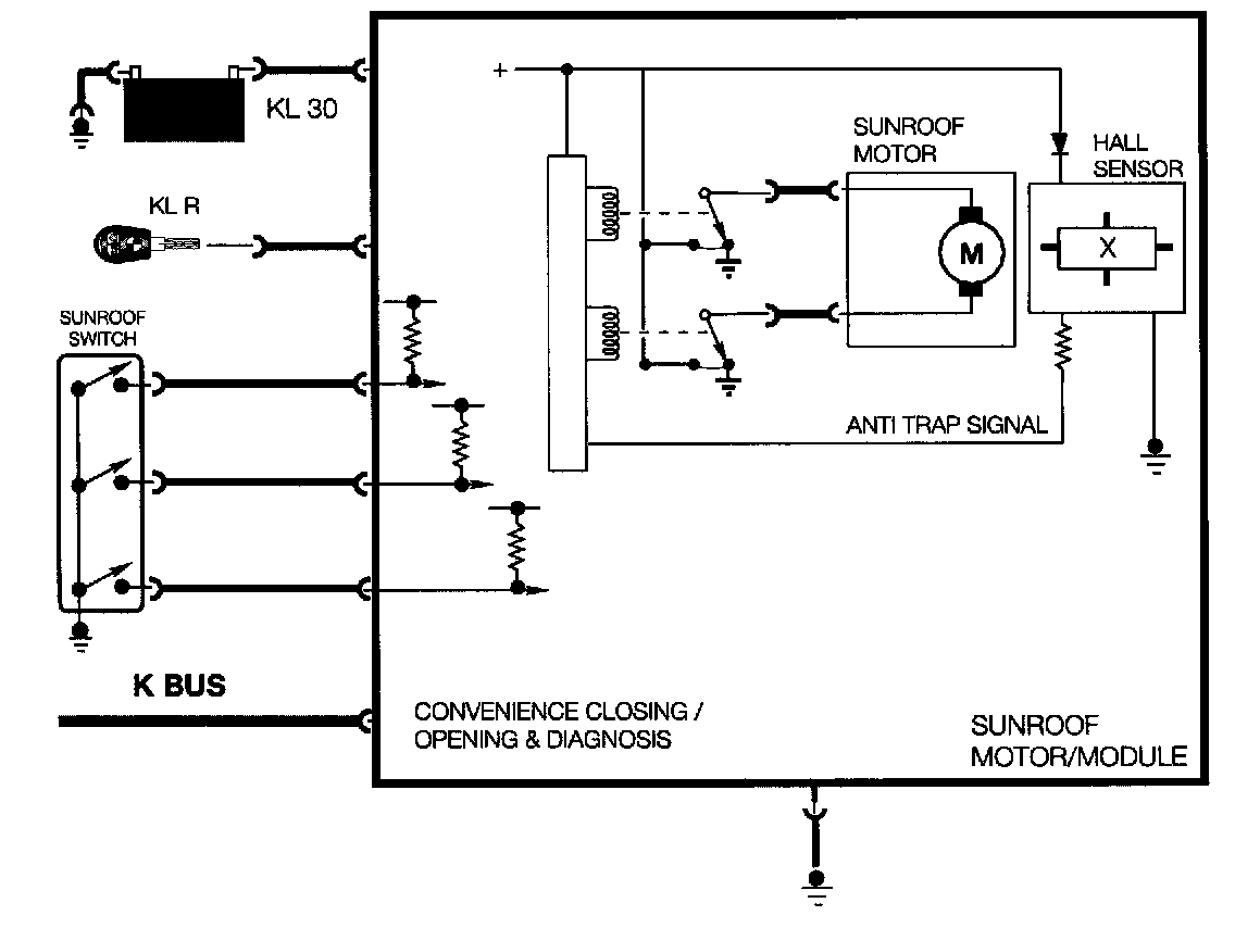The E46 optional sunroof is mechanically similar to previous systems. All of the electronic controls and relays are contained in the sunroof module (SHD). The module is connected to the K-Bus for comfort closing/opening, unloader signalling during engine start-up, diagnosis and fault memory purposes