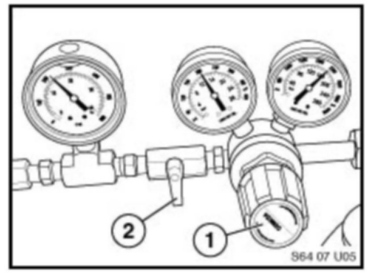 8. Once the proper adapters have been fitted, connect the nitrogen bottle (1) with the pressure reducer (2) to the pressure gauge (3). Connect the special hose (64 5 121) to the fitting on the pressure gauge and the test adapter on the vehicle.