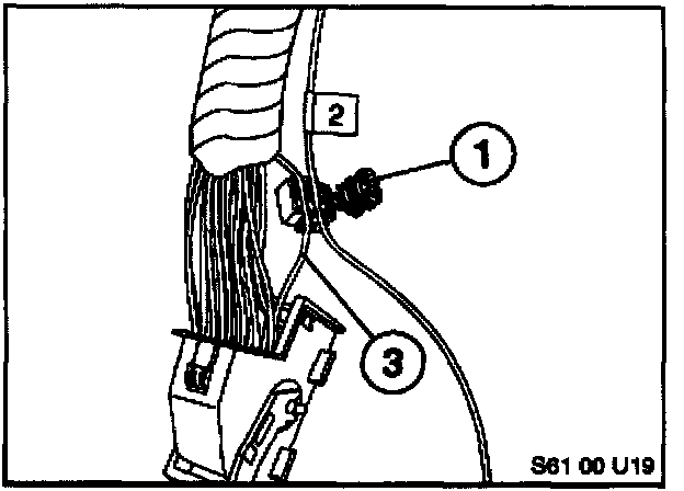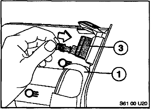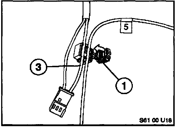 16. Remove the blank from the driver's side kick panel (1), and install the trunk release switch (3) P/N 61 31 8 365 579. Install connector X1295 completed in step 12.
