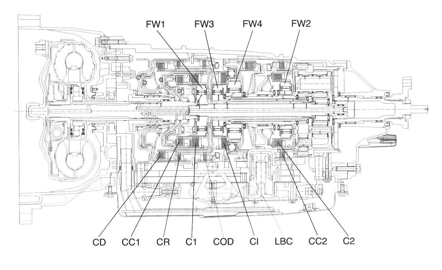 - Five multi-plate brake clutches with single sided friction plates, Four Free Wheel One Way Clutches (sprag type)
