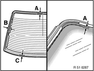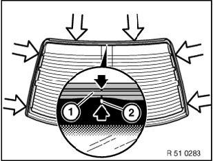Install rear window carefully using special tool 51 3 010. The gasket must make uniform contact all round (center). Press rear window upwards until gasket is at uniform distance from roof all round.