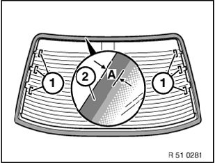 Treat rear window around glued area (A) with materials approved by BMW (repair kit, sourcing reference: BMW Parts Service).