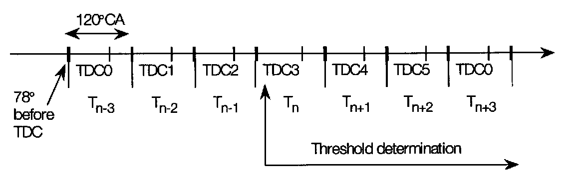 The misfire/engine roughness calculation is derived from the differences in the period duration (T) of individual increment gear segments. Each segment period consist of an angular range of 120° crank angle that starts 78° before Top Dead Center (TDC).