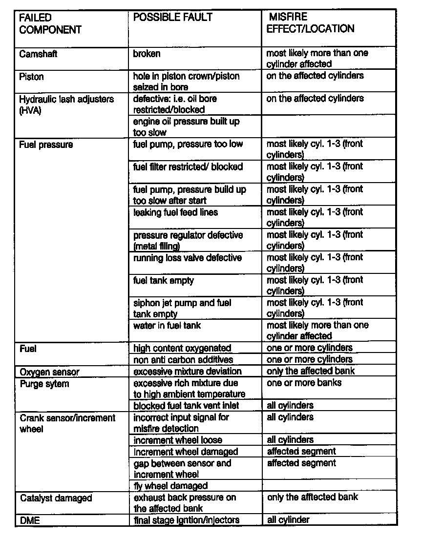 If the expected period duration is greater than the permissible value a misfire fault for the particular cylinder is stored in the fault memory of the DME. Depending on the level of misfire rate measured the control unit will illuminate the "Check Engine" light, may cut-off fuel to the particular cylinder and may switch lambda operation to open-loop. All misfire faults are weighted to determine if the misfire is emissions relevant or catalyst damaging.