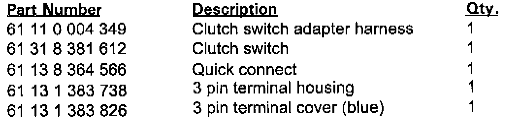 In order to upgrade to the three wire switch an adapter harness and new clutch switch (P/N 61 31 8 381 612) must be installed. The adapter harness installs as follows:
