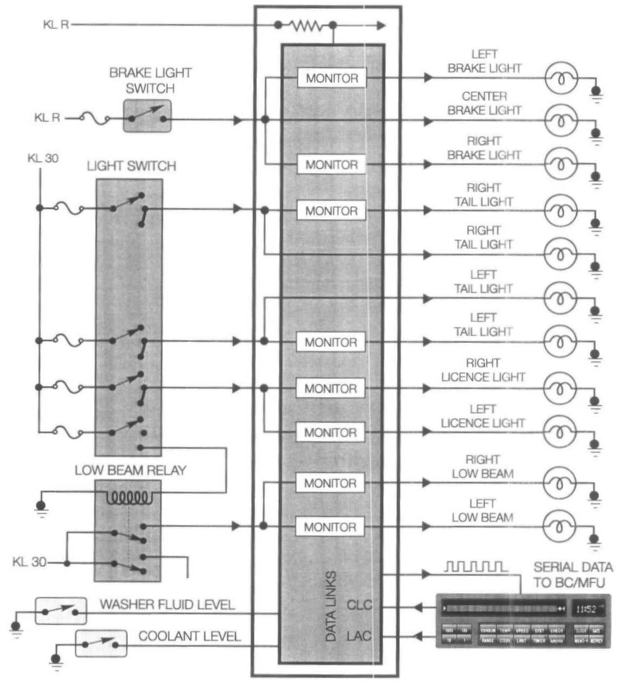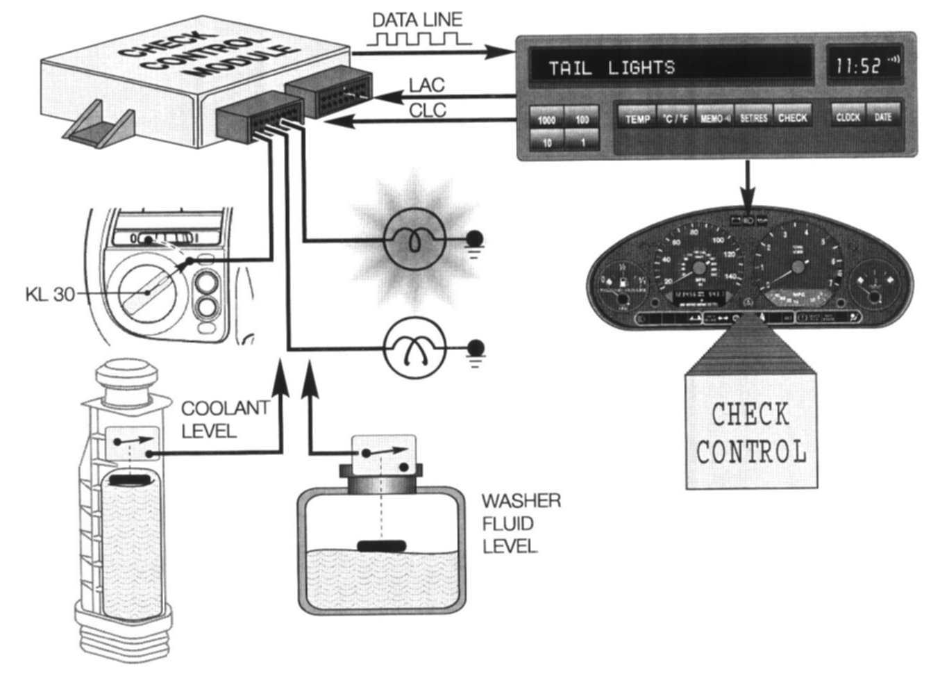 The Check Control is an active warning system that displays various lighting circuit failures and low fluid level warnings. It is only available on the listed models if they are equipped with the Multi-Function Clock or On-board Computer. Failure warnings are displayed in the matrix of the LCD panel on these units.