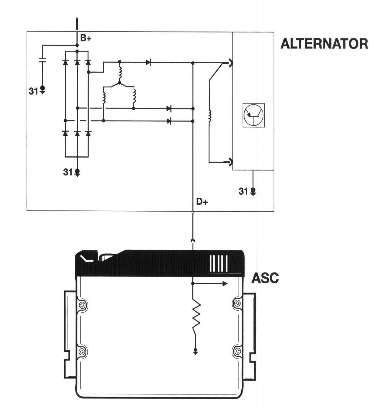 The D+ circuit of the alternator/regulator (KL 61) is provided to the ABS/ASC control unit for ABS operation.