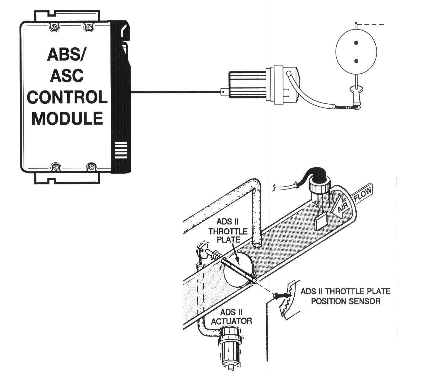 Activation of the Engine Intake Air Control (ADS II) motor is an output function of the ASC/ADS II control module. During ASC control that requires throttle reduction to restore traction or maintain stability, the ASC control module will signal the ADS II module (early ADS control) or directly activate the ADS II actuator closing the ADS throttle valve for engine power reduction.