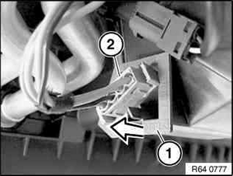 Pull out resistor for heater - A/C fan (1) in direction of arrow (as shown) and remove.