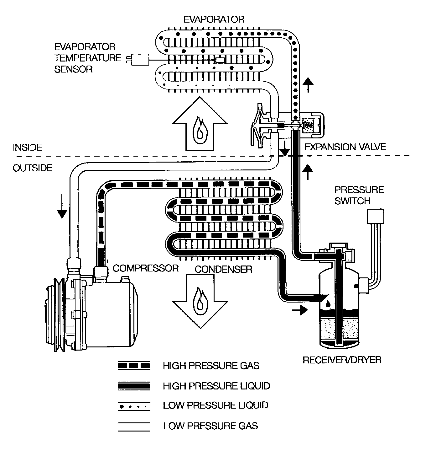 When the A/C compressor clutch is engaged, the compressor draws in low-pressure refrigerant gas. It compresses the gas and moves it to the condenser. Compressing the gas raises its temperature above that of the outside air. As the hot, high-pressure gas flows into the condenser, cooler air flowing across the condenser absorbs heat from the gas. As the refrigerant gives up heat to the air, it condenses and changes to a liquid.