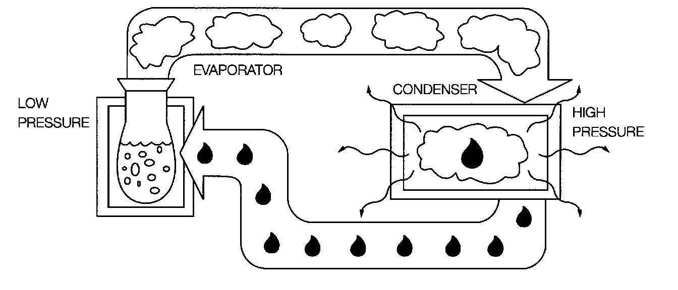 In an air conditioning system, the pressure in the evaporator is low, so that all the refrigerant vaporizes. The pressure in the condenser is high, so that all the refrigerant readily changes state to a liquid.