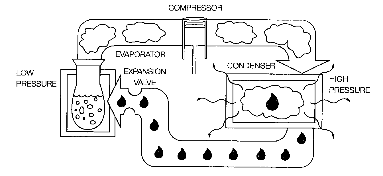 In an A/C system, heat is transferred using a refrigerant. The refrigerant absorbs heat from air entering the passenger compartment, carries the heat outside the compartment, releases the heat, and then re-enters the compartment to begin the cycle again.