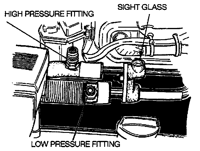 The R-12 system utilizes "schrader" valves for connecting the recycling station hoses to the high and low pressure sides of the refrigerant system. Care must be taken when connecting the hoses to the fittings since they are identical.