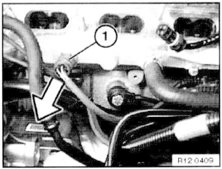 - Unfasten plug connection (1) (Illustrated here without Intake air manifold).