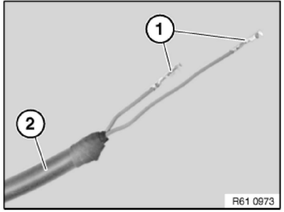 Remove the fabric adhesive tape from the vehicle wiring harness and slide back insulating sleeve (1) approximately 300 mm.