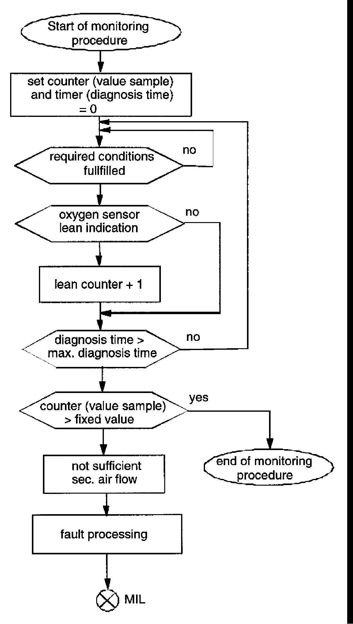 Any time the oxygen sensor indicates a lean mixture within the maximum time for monitoring, a counter is incremented by "one" up to a predetermined value. This fixed limit corresponds to the minimum amount of secondary air (low-flow-limit-check).