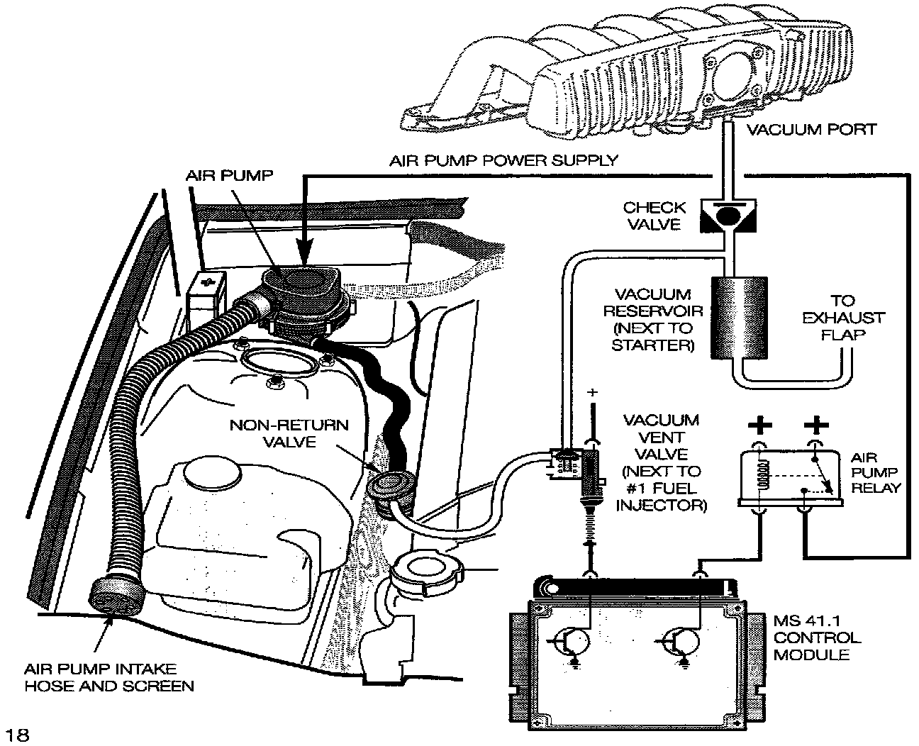 The vacuum/vent valve is mounted to the intake manifold next to fuel injector #1. The MS 41.1 control module activates the vacuum valve when the air pump is energized. Vacuum is applied to the non-return valve and air passes through the cylinder head and into the exhaust manifold.