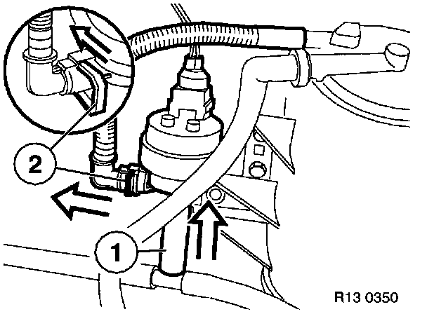 - Press down locking bracket (2), remove hose.