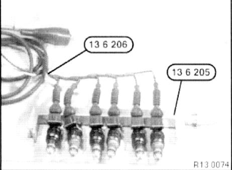 - Attach injector valves to special tool 13 6 200 with special tool 13 6 205.