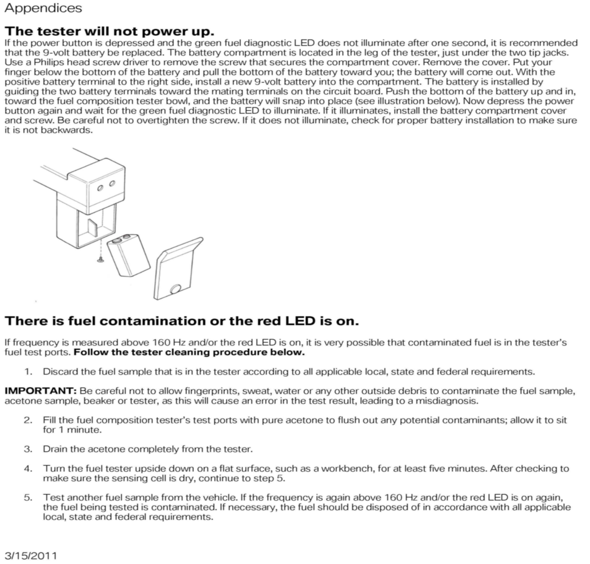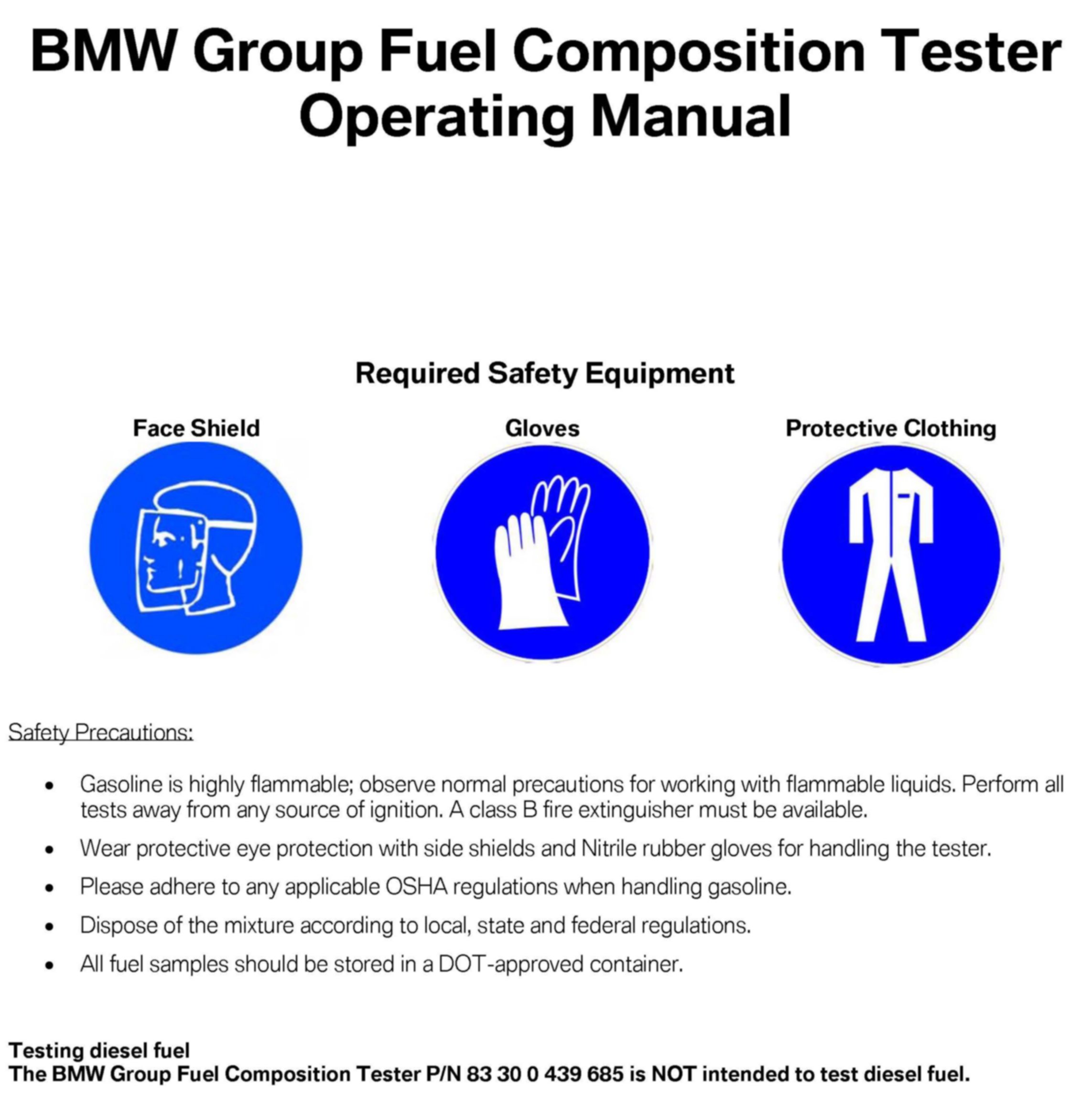 ^ Gasoline is highly flammable; observe normal precautions for working with flammable liquids. Perform all tests away from any source of ignition. A class B fire extinguisher must be available.