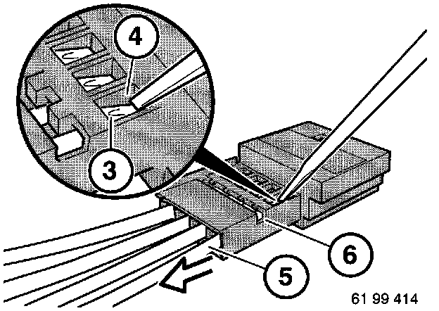 - Hold down arrester hook (3) of defective contact and pull cable and contact up to secondary lock (6).