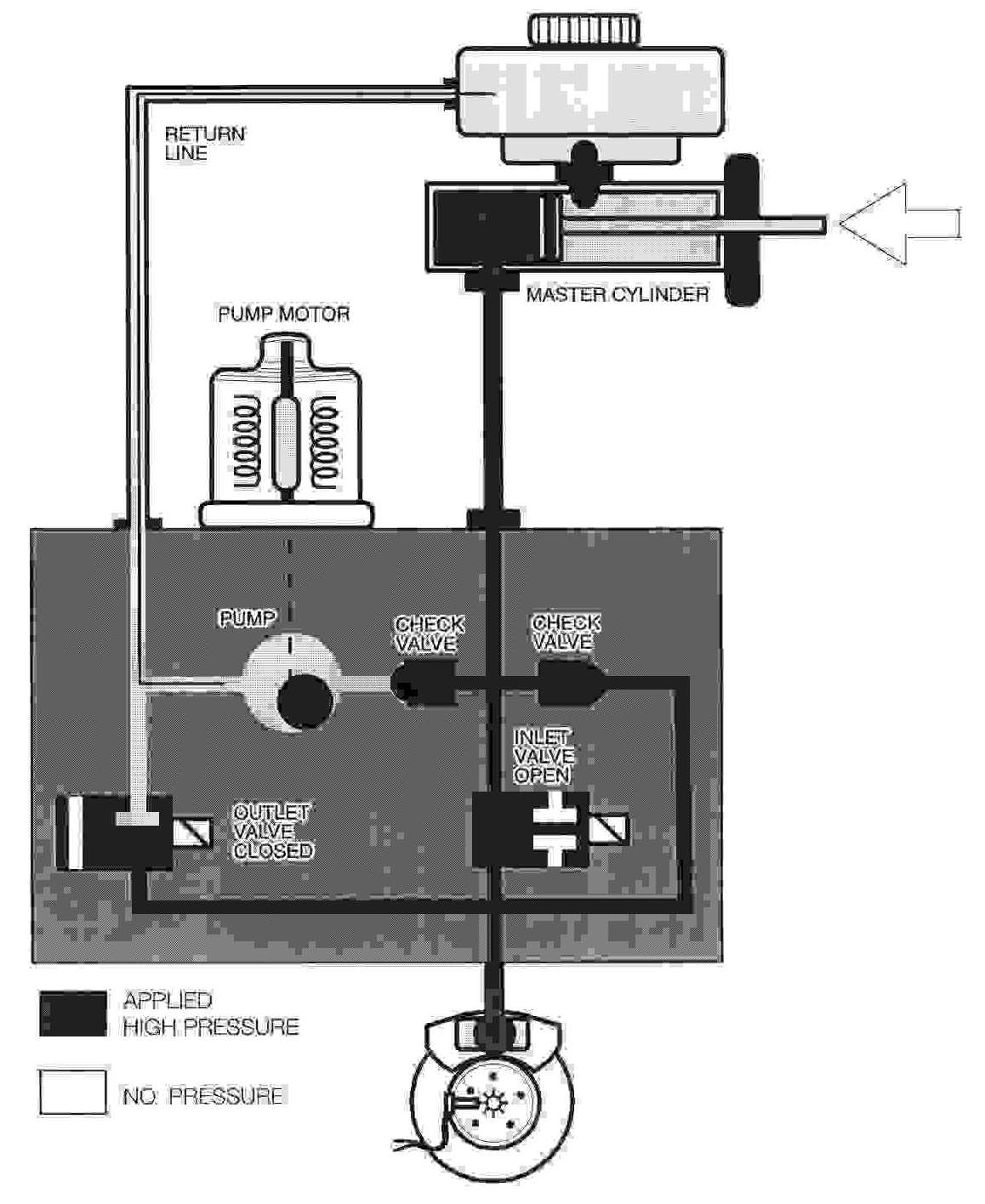 - The pump pushes the brake fluid through the open inlet valve and causes the caliper to apply brake pressure. The inlet valve is energized and closes the the inlet port.