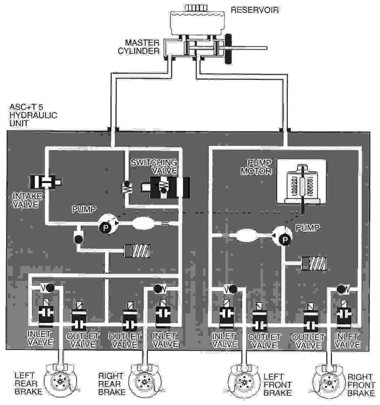 The illustration below shows a complete ASC+T hydraulic unit. The rear brake control is accomplished by the control module activating the solenoids and pump as follows: