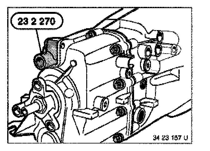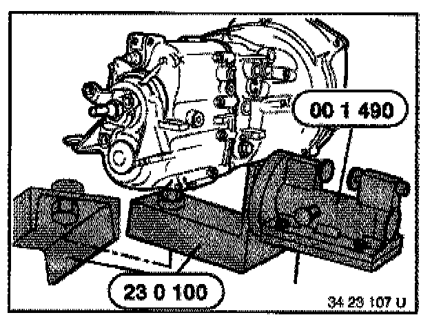Screw Special Tool 23 0 100 (transmission support) into bore of drain plug and secure.
