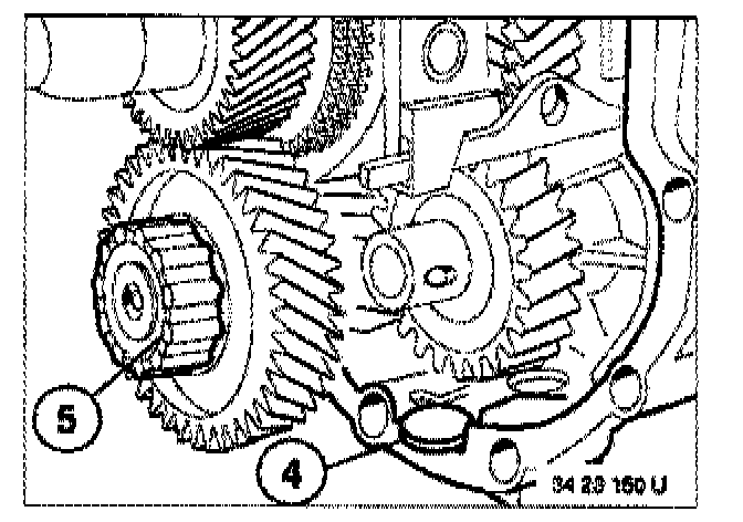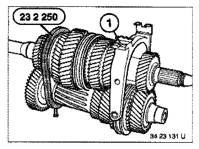 Compress gear set at 5th/reverse gear operating sleeve with layshaft. Use Special Tool 23 2 250.