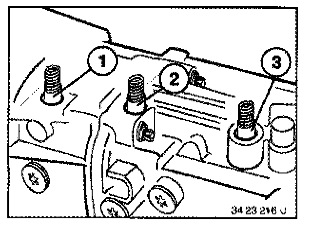 Place catch pins (1 - 3) with compression springs in the shift arms.