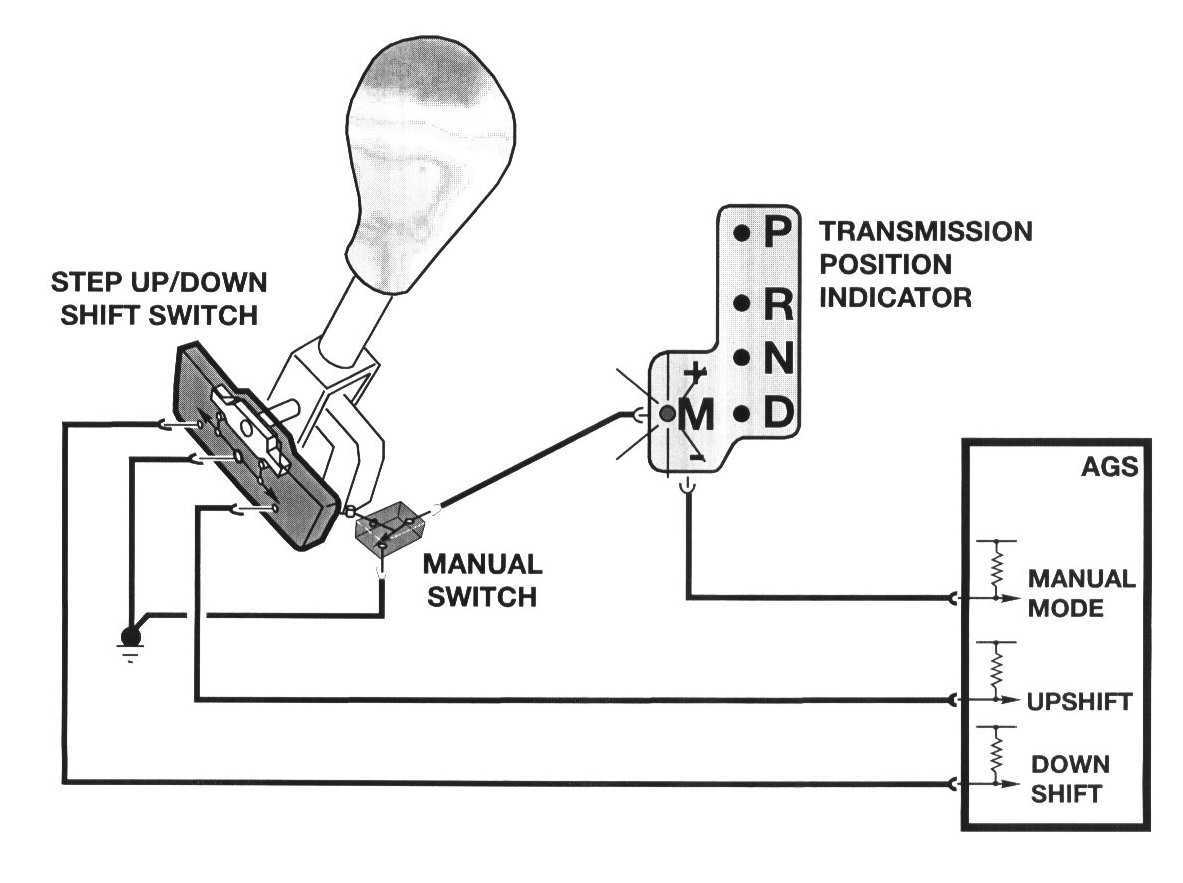 When the Steptronic Shifter is moved to the left 15° into the manual gate, the AGS receives a switched ground signal from the manual gate switch. The ground signal is provided to the AGS thorough the Transmission Position Indicator. The Transmission Position Indicator also provides range position signalling to the Range Position indicator in the shift console.
