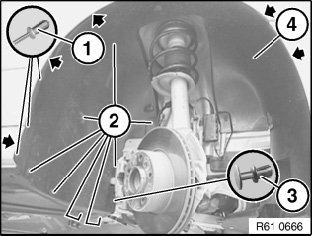 Remove front wheel arch cover (4).