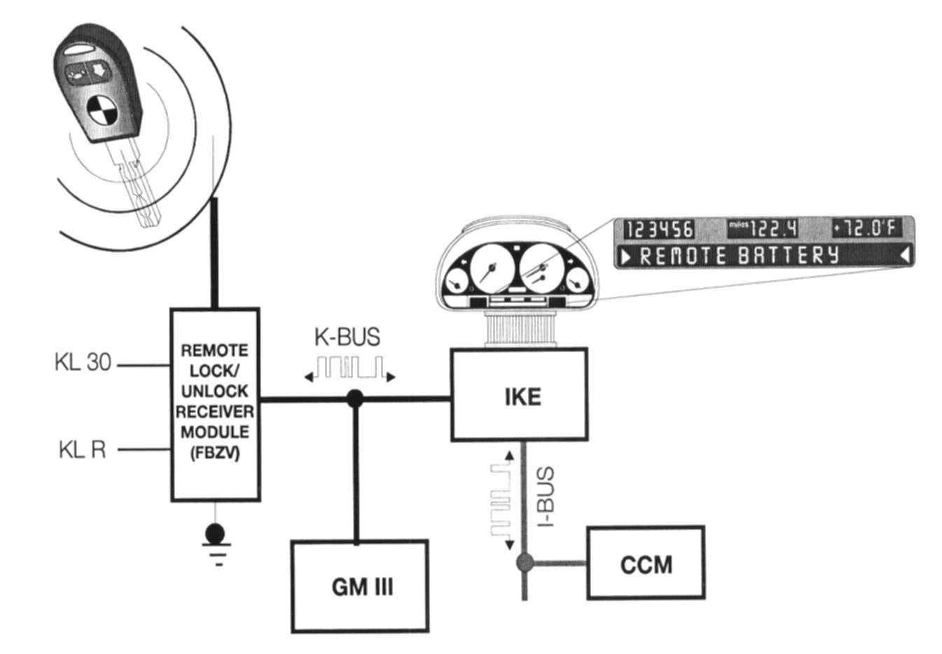 The state of charge of the transmitter batteries is monitored by the control module. Once the voltage level of the transmitter drops below 4.5 volts, the LED will no longer signal transmitter operation. Convenience opening, initialization and self-testing are no longer possible. The control module will store the low battery level and post a message in the check control display will the door is opened.