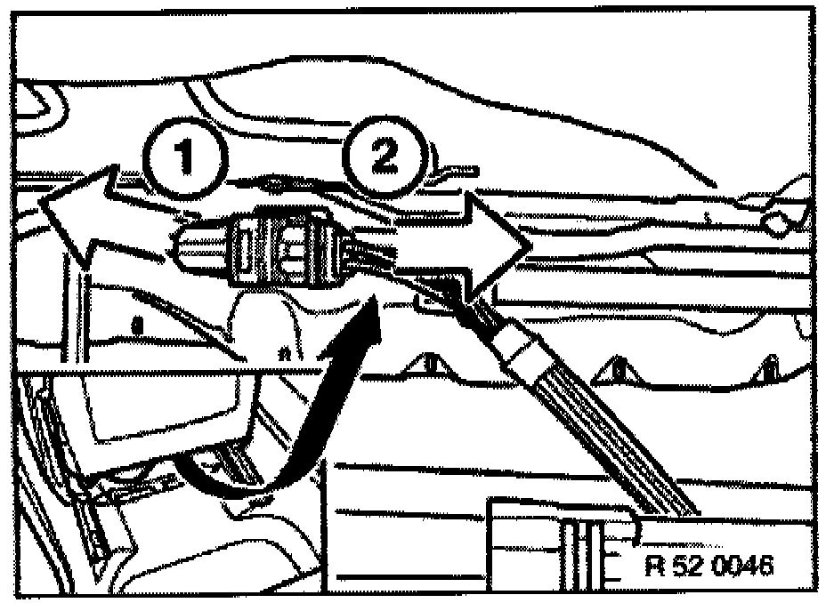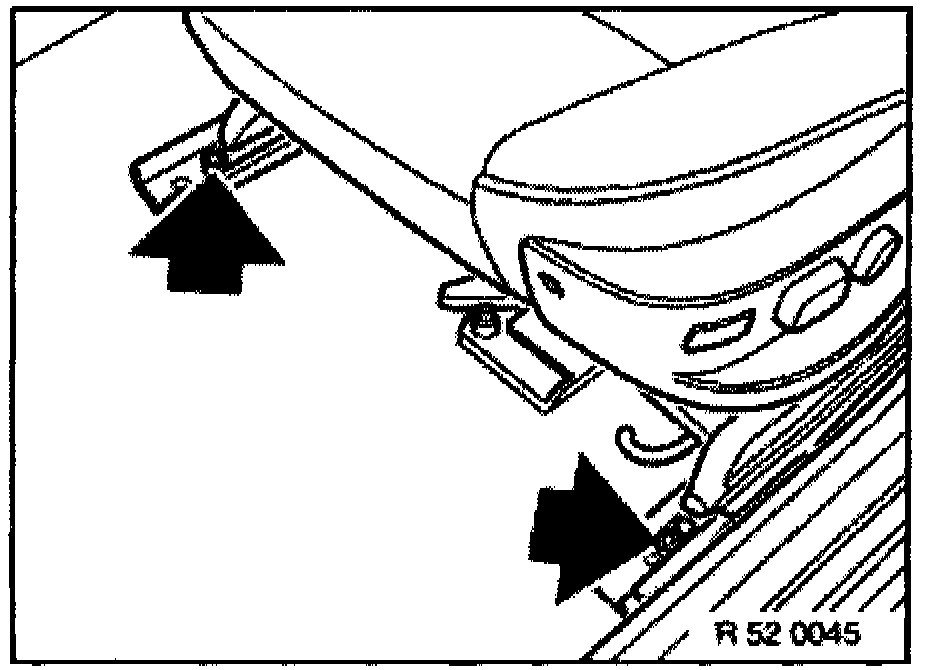 - Pull retainer (1) backwards to unlock and pull inwards to remove. Lift Bowden cable (2) forwards to remove for seat belt adjustment.