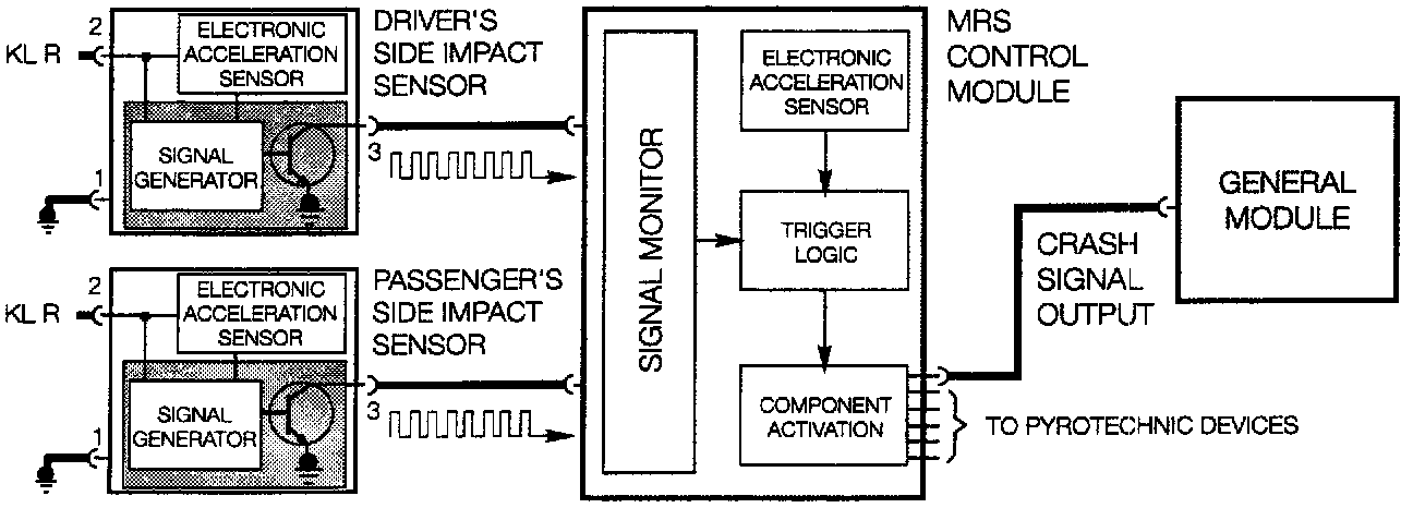 Electronic (piezoelectric) sensors are used for side impact detection. They are mounted at the left and right front footwell cross members. The sensors receive power (KL R) and produce a pulse width modulated (PWM) input signal to the MRS control module for side impact detection. The pulse width of the signal decreases in proportion to the severity of the impact.