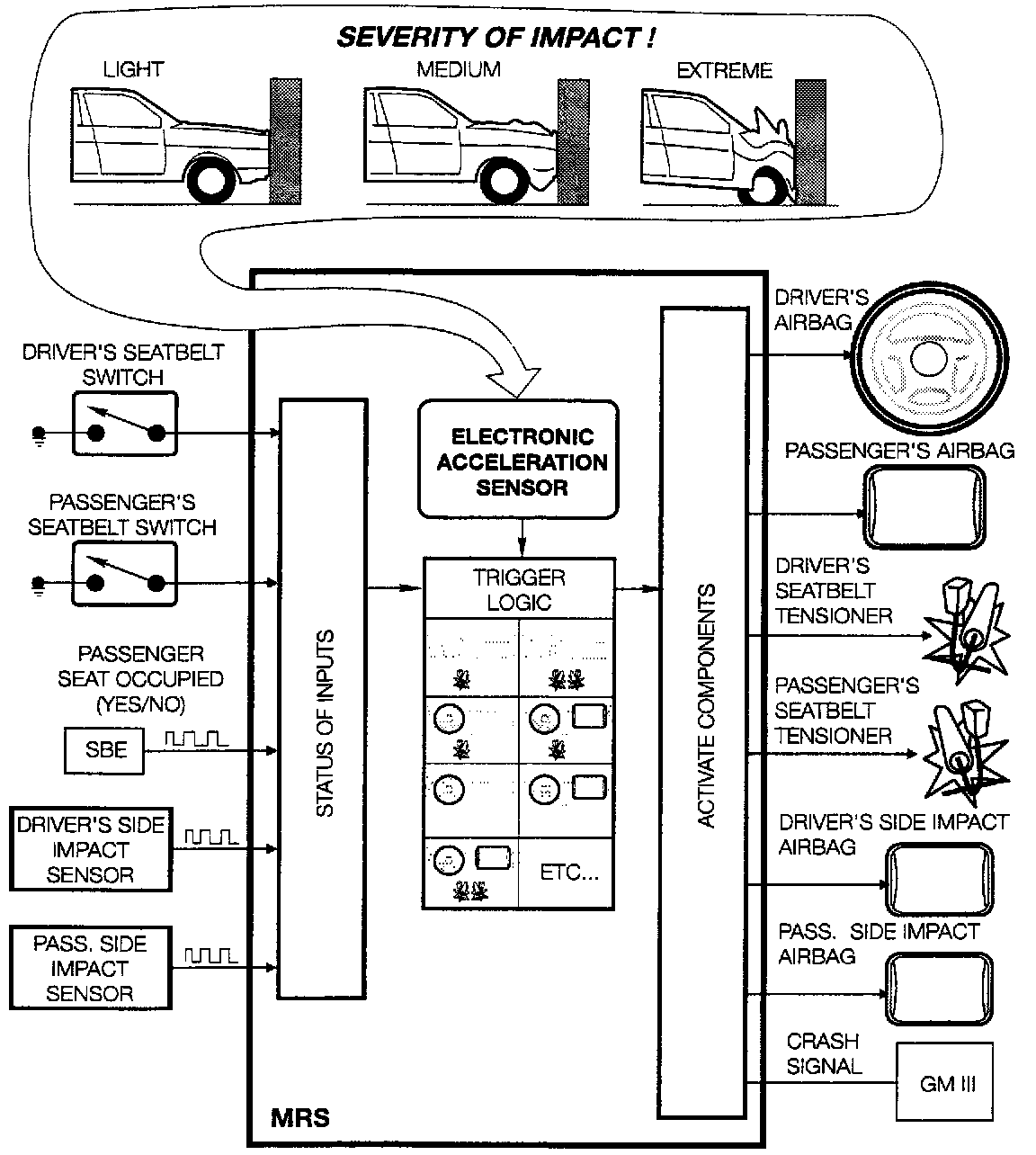 The MRS system is being introduced on the 1997 E39 and 1996 E38s as of 3/96 production. The following components are new to the central airbag system. Combined with the existing familiar components makes up the MRS system: