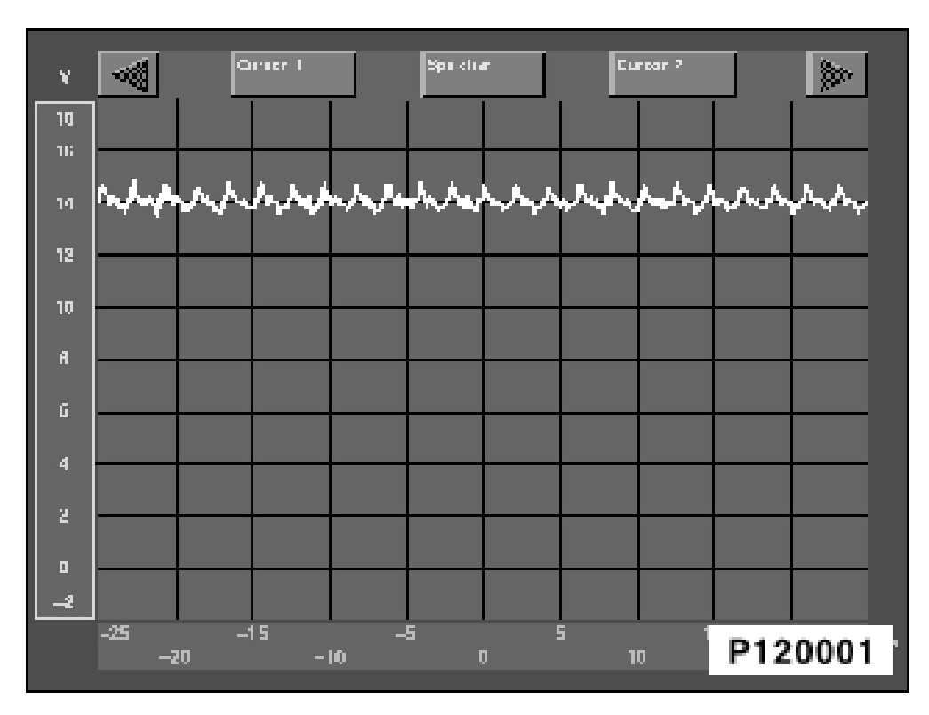 The displayed signal is outside the voltage range between 9 V and 16 V at the voltage peaks and/or voltage dips. Depending on the type of fault, the voltage peaks can extend over the entire measuring range. This case indicates a break, short to ground or short to positive.