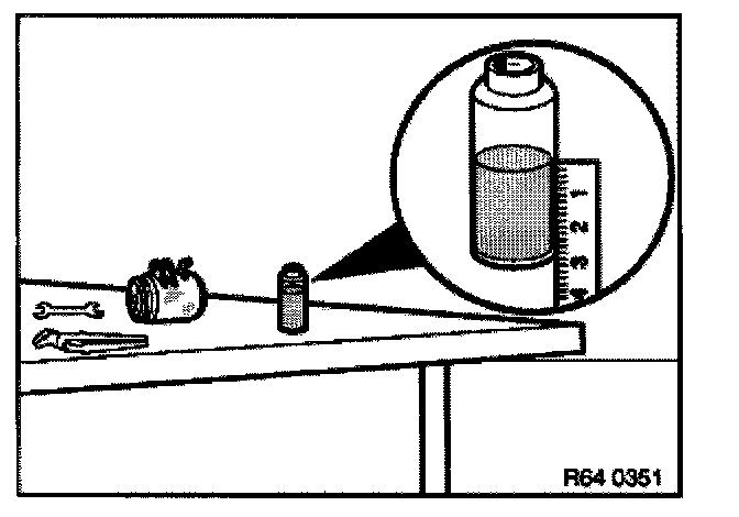 After evacuation, the refrigerant must be filtered in the service station as the oil separator could still contain a liquid refrigerant/oil mixture. The filtering process gasifies the refrigerant completely and only the previously bound refrigerant oil remains in the oil separator. Measure and note down this amount of refrigerant oil.